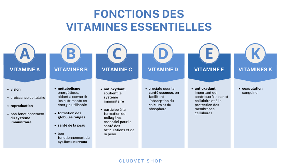 Les vitamines ainsi que les autres nutriments essentiels (protéines, lipides, glucides et minéraux) jouent un rôle majeur dans leur santé globale, soutenant diverses fonctions physiologiques.