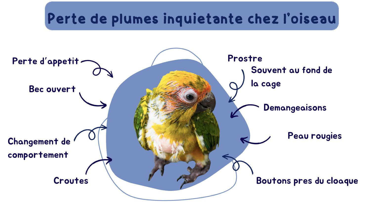 En règle générale, si votre oiseau présente simultanément une perte de plumes, une perte d'appétit, une peau croûteuse ou rouge, un comportement changé (vocalises / agressions), il faut consulter un vétérinaire spécialiste rapidement.