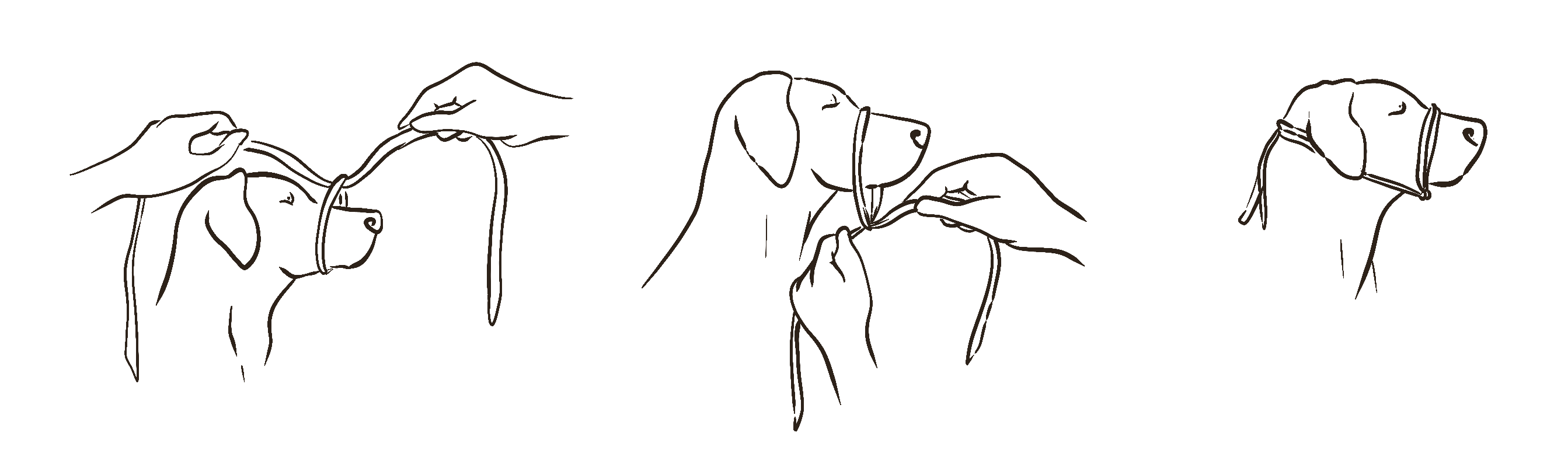 - croisez les deux brins du lien sous le museau et passez-les derrière la tête pour les nouer.