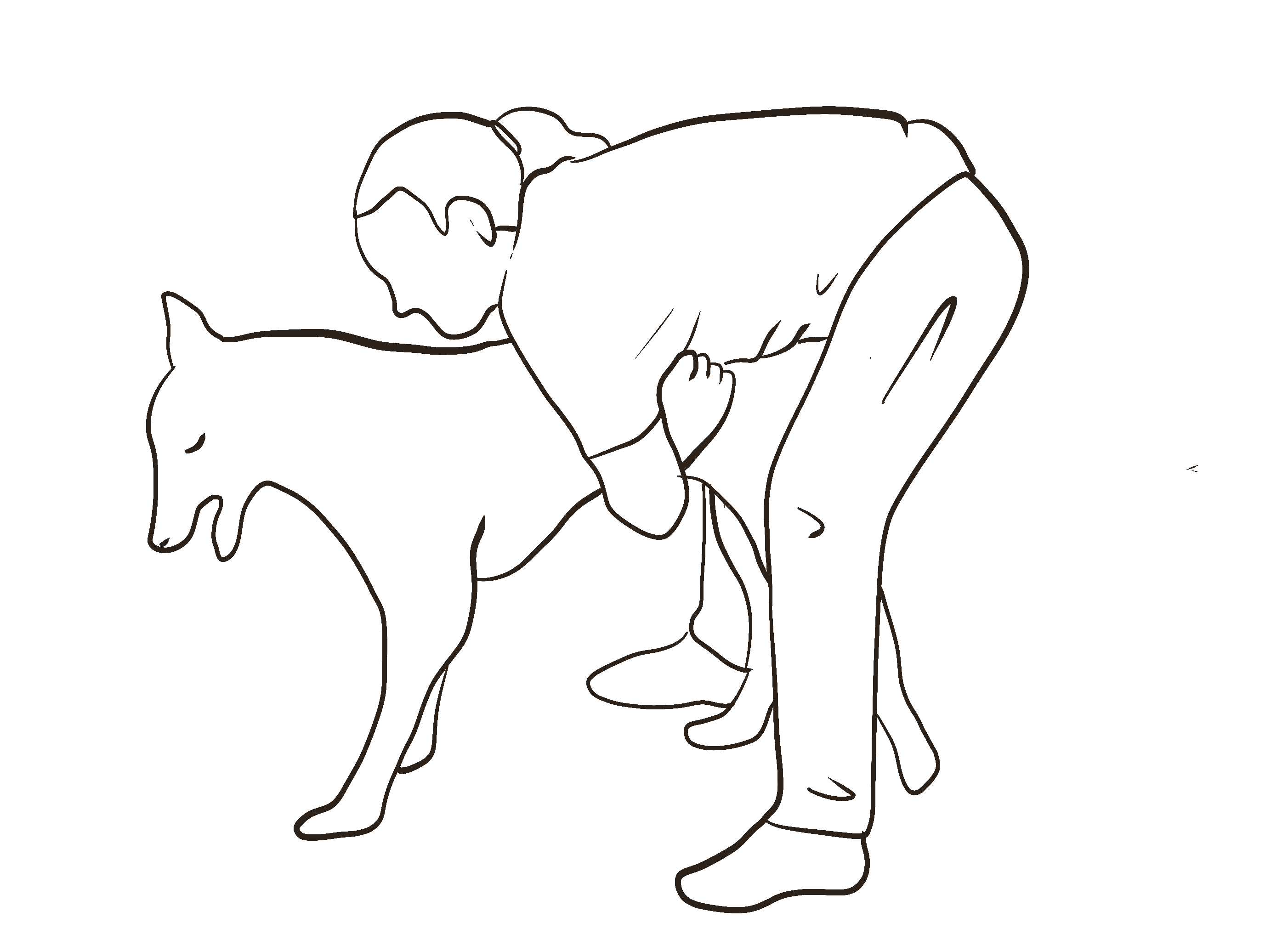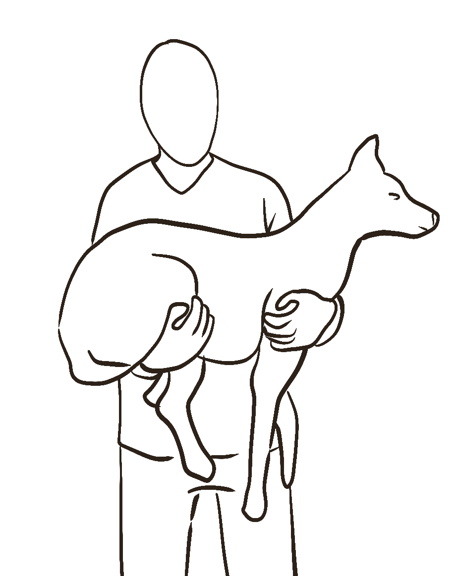 Si vous devez transporter un grand chien seul, attention à ne pas vous blesser. Accroupissez-vous, gardez le dos droit et maintenez l'animal par le poitrail et les fesses.