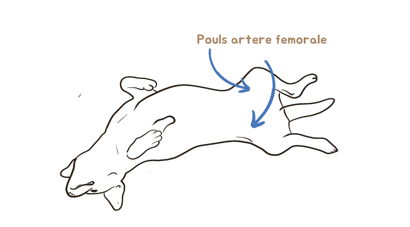 - pratiquez 2 insufflations dans la truffe, si le thorax bouge, vérifiez le pouls (avec 2 ou 3 doigts dans la face interne de la cuisse), s'il est présent, continuez les insufflations, s'il est absent, commencez le massage cardiaque.