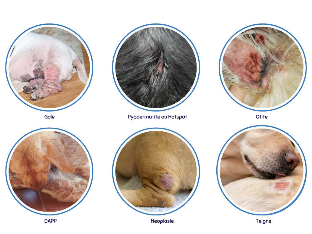 Ces troubles dermatologiques peuvent être aigus ou chroniques, et leurs causes sont variées : génétique, allergies, infections, parasites, troubles comportementaux ou problème environnemental, etc. Ils se manifestent par des rougeurs, démangeaisons, irritations, lésions et parfois des desquamations.